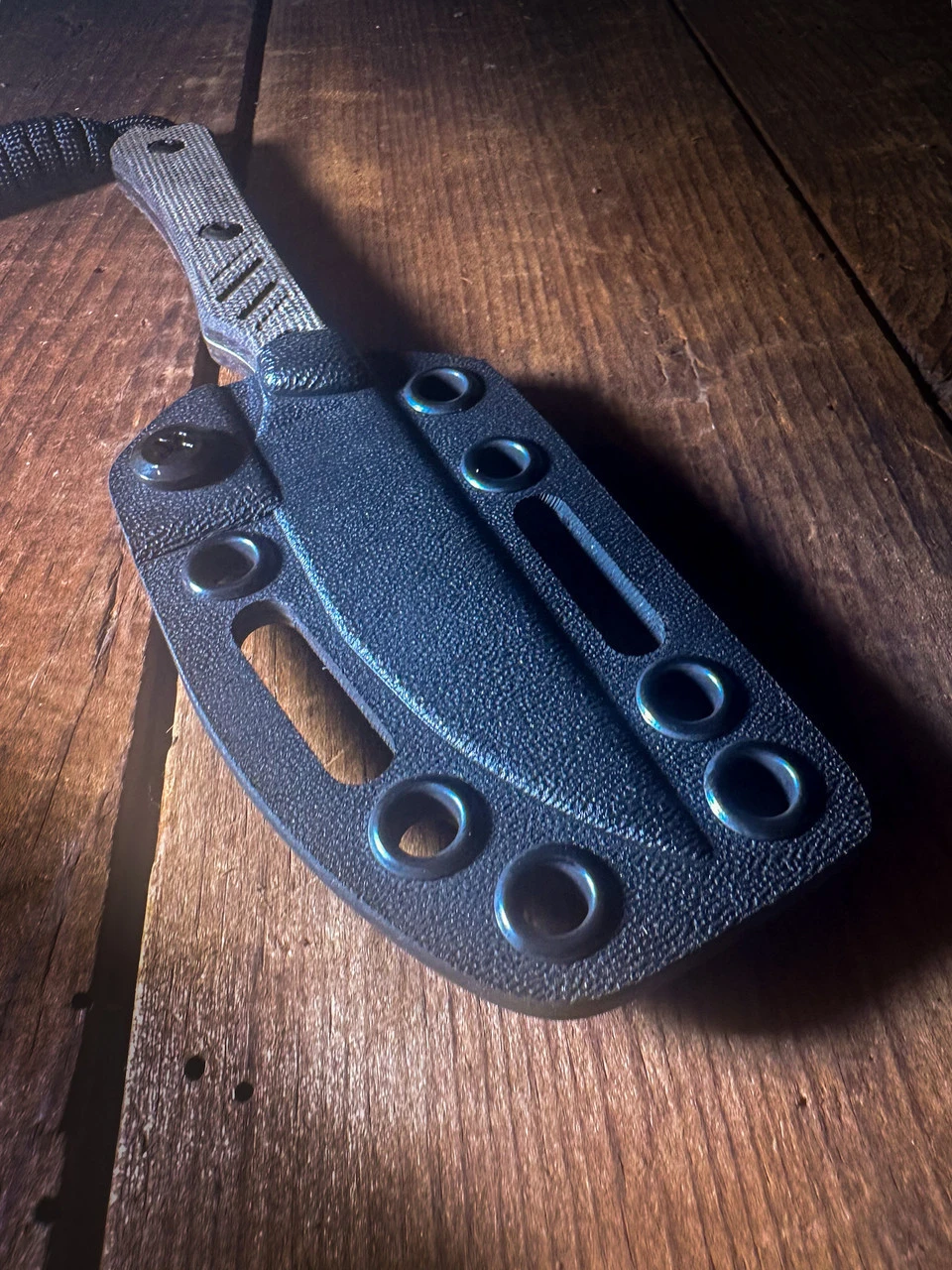 -Kydex: Streamlined and low-profile. The production version includes adjustable retention and a paracord neck lanyard.