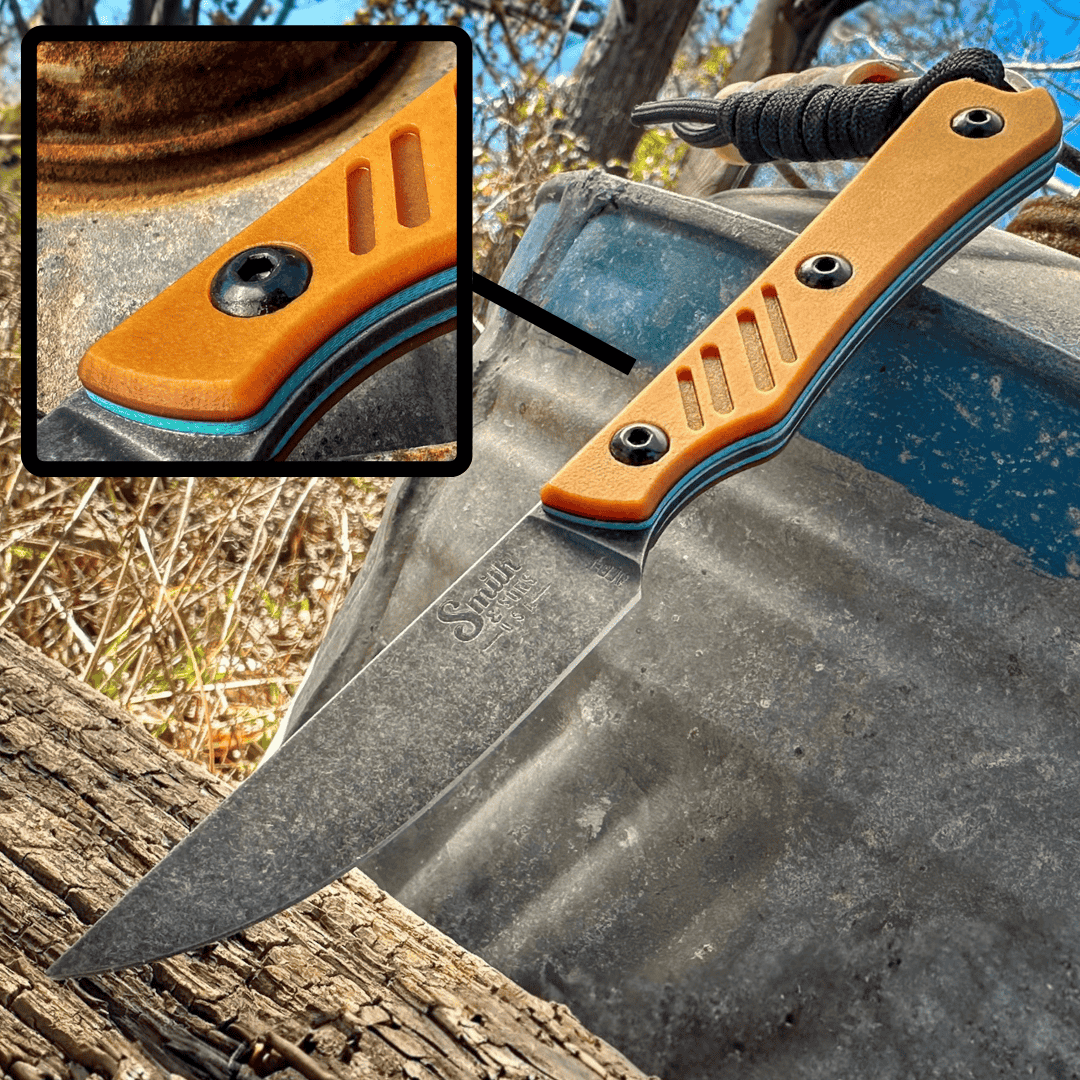 This listing is for one variant from a custom drop of SHOALS, each specially crafted with premium materials and built in-house by our knifemakers. This piece features Natural Paper Micarta scales w/ Teal G-10 Liners.